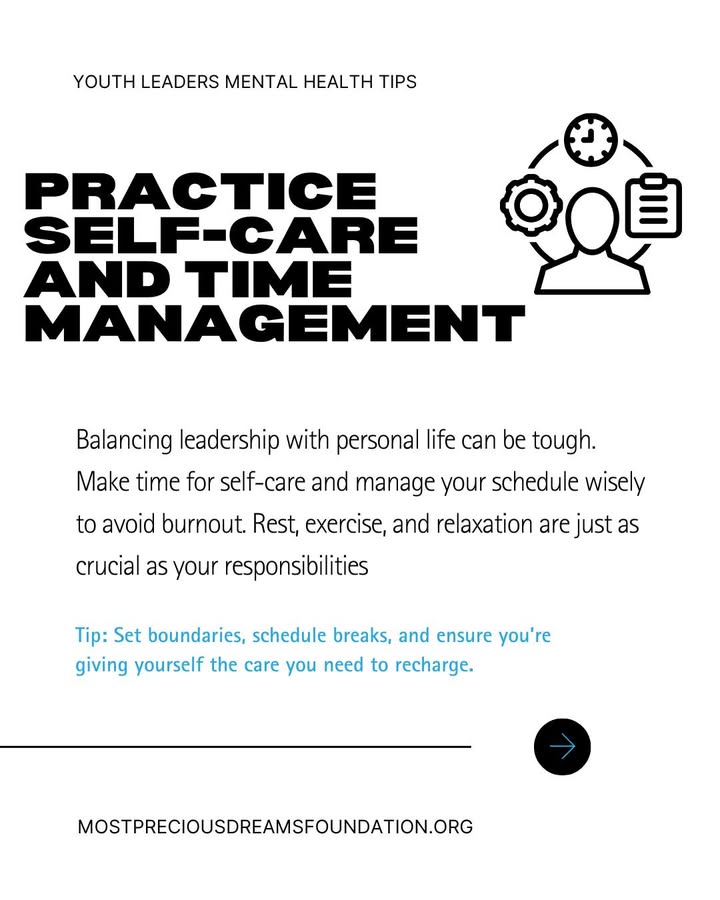Swipe for practical mental health tips to help you stay centered, manage stress, and embrace self-care. Mental well-being is a vital part of thriving as a leader. Remember, every small step toward wellness counts.